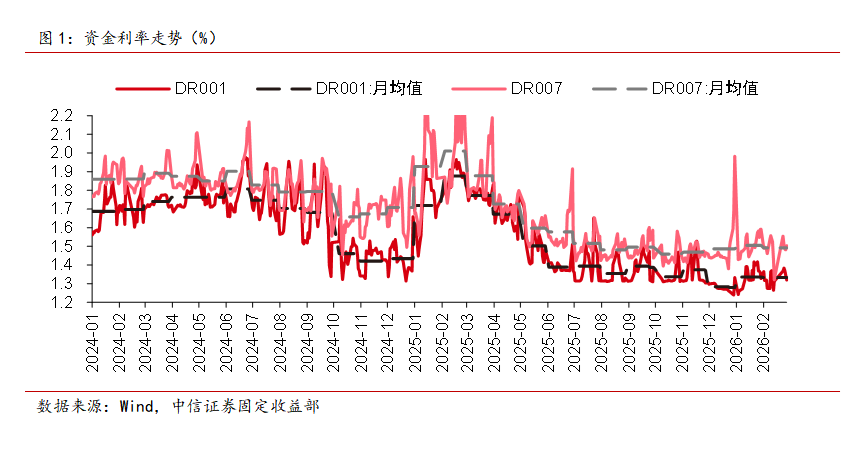 回顾2月资金面,政府债融资压力进一步提升与企业结汇需求增加给流动性带来一定冲击,但央行通过MLF与买断式逆回购等工具合计实现流动性净投放7795亿元,春节前后资金面波动相对可控,节后税期与跨月时点资金也整体平稳,DR001与DR007利率中枢均小幅下行。整体而言,今年以来资金市场利率低位震荡、同业存单收益率持续下行,既反映当前银行体系流动性整体充裕,又隐含了市场对央行后续货币政策仍持较为积极态度的预期。