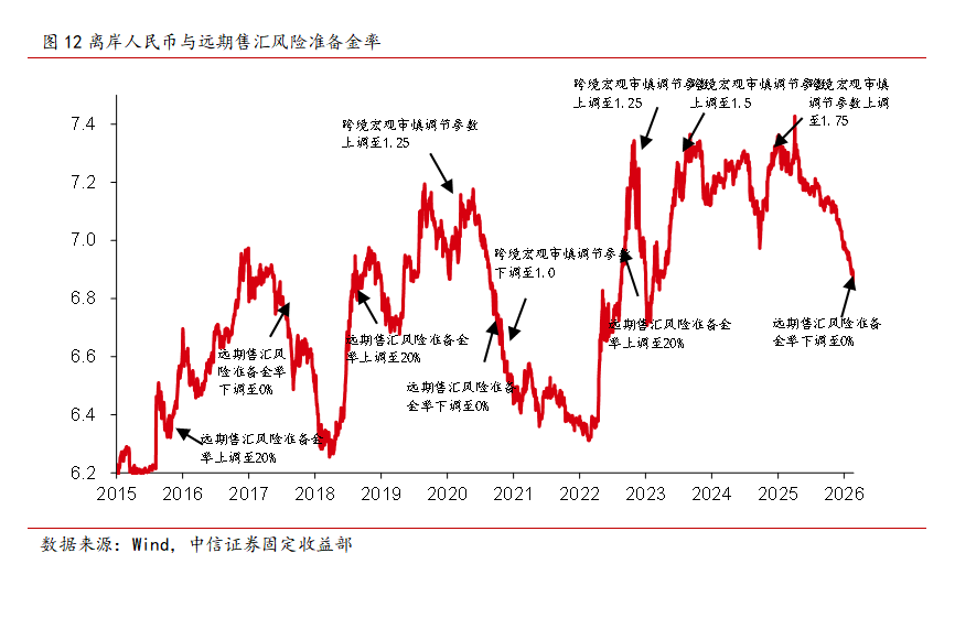 具体而言,2022年以来我国贸易顺差始终维持高位,但结汇规模却相对有限,企业结汇压力不断累积,以外币收付款差额与银行代客结售汇顺差进行测算,2026年1月末仍有约7100亿美元的资金尚未结汇,在人民币升值预期下企业结汇需求集中爆发,2026年1月银行结售汇顺差处于888亿美元的历史高位。为缓和人民币汇率过快升值势头、稳定外汇市场预期,央行也时隔3年再度调整远期售汇业务的外汇风险准备金率,将其由20%下调至0。在美伊战争数周结束的假设情形下,预计美元后续回落和企业结汇力量延续支撑下,人民币汇率将呈现双向波动、温和升值的特征。