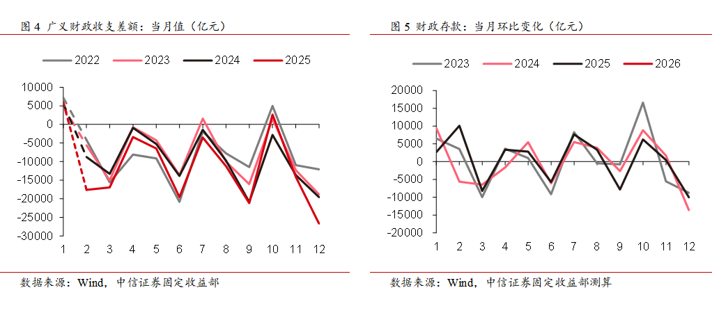 回顾历史经验,3月财政收入总量通常相对较低。从收入端来看预计2026年3月广义财政(一般公共预算与政府性基金预算之和,下同)收入总量或在1.9万亿元左右。受2024年“924”后的高基数影响,2025年12月当月一般公共预算收入同比大幅下降25%,拖累2025年全年一般公共预算收入最终同比-1.7%,低于0.1%的年初目标。全年来看,2025年一般公共预算收入的结构有所优化,工企利润由负转正带动税基整体温和复苏,税收收入同比增长0.8%,与此同时非税收入则大幅下降11.3%,财政对于非税的依赖程度降低。展望后续,2026年我国基本面温和修复进程或将延续,3月公共财政收入总量或在1.65万亿元左右。此外, 1月以来二手房挂牌价震荡回升,并且近期二手房成交面积也升至近五年高位,今年土地出让收入降幅有望进一步收窄,3月政府性基金收入总量或在2700亿元左右。综上所述,预计2026年3月广义财政收入总额大约1.9万亿元。