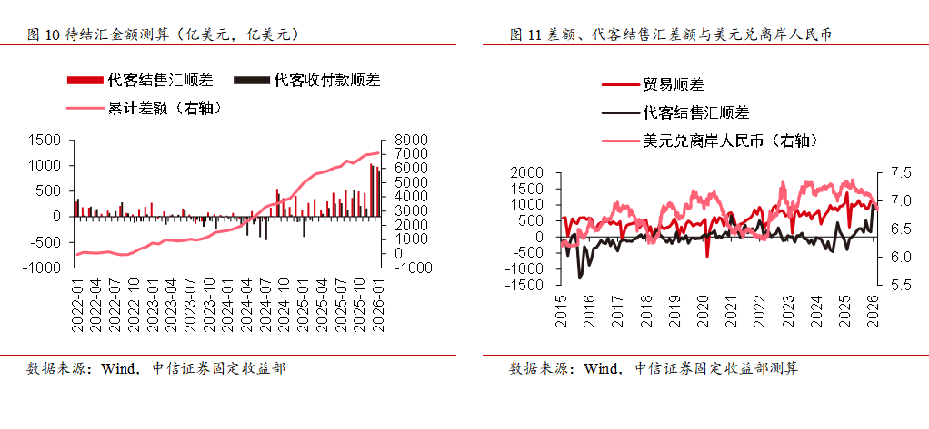 今年前两个月受美元指数走弱、企业季节性结汇等因素影响,人民币汇率步入温和升值区间,3月初美伊战争爆发后短期避险情绪虽带动美元走强,但在战争数周内结束的基准假设下强美元叙事或难持续,并且据测算当前有约7100亿美元尚未结汇,也有望对人民币汇率重回温和升值区间提供支撑。