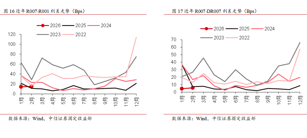 2026年政府工作报告将货币政策目标由“促进社会综合融资成本下降”调整为“低位运行”,央行在3月6日经济主题记者会上提及将“灵活高效运用降准降息等多种货币政策工具”并强调规范融资中间费用以畅通货币政策传导,或意味着降低融资中介费用将成为提升总量宽松政策传导效果的重要并行条件。展望3月,人民币汇率处于温和升值阶段且输入性通胀预期升温对宽货币制约有限,央行将继续通过短中长期等多种货币政策工具对冲季末扰动并保持流动性充裕,3月隔夜资金中枢或处在政策利率下方,R-DR利差也有望维持低位。