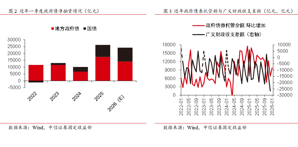 2026年作为“十五五”的开局之年,财政政策“更加积极”既意味着将保持必要的财政赤字、债务总规模和支出总量,同时也需要为应对未来风险留有余地,确保财政的可持续性并提高精准性和有效性,今年财政预算中政府债新增规模13.89万亿元,较去年温和扩张。开年以来政府债融资进度持续偏快,1-2月地方债与国债的净融资额均处于历史同期高位,展望3月,以地方新增专项债为主的政府债券发行或将继续提速,预计3月财政净融资规模将维持在较高水平,或在9600亿元左右。